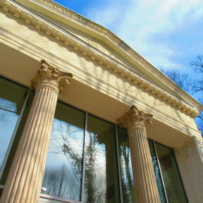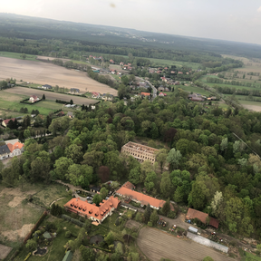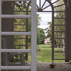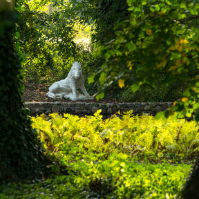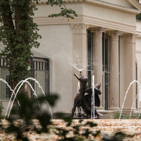In der Nähe von den Teichen sind zwei wichtigste Parkattraktionen, die Schlossruine und wieder aufgebaute Orangerie. Die Ruine wurde abgesichert und ist jetzt für Besucher zugänglich. In der Orangerie gibt es ein Café, wo Sie sich einen aromatischen Kaffee und einen leckeren Kuchen oder ein Dessert ergötzen können. Im Sommer kann man sich auch im Rankgitter entspannen, das die Orangerie mit dem Schloss verbindet. Wenn Sie auf dem Schlosshof stehen, ist es unmöglich zwei Brunnen zu übersehen. Der repräsentativste ist der Brunnen mit der Nachbildung der Skulptur „Knabe mit dem Schwan”, der vor dem Haupteingang der Residenz steht. In der Umgebung der klassizistischen Orangerie befinden sich noch ein effektvoller Kreuzbrunnen und eine Nachbildung von einem antiken Sarkophag aus dem 3. Jahrhundert u. Z.