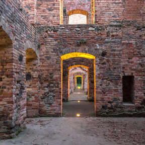 Wenn man in den Osten von der Schlossruine spazieren geht, kann man ein Aussichtsberg mit einer Grotte sehen. Auf seinem Gipfel ist eine schöne Laube (Rosentempel) gelegen. Von dort aus erstreckt sich ein wunderbarer Blick über die Wiese und die Schlossruine. Der Rosentempel ist auch perfekter Ort für romantisches Treffen.